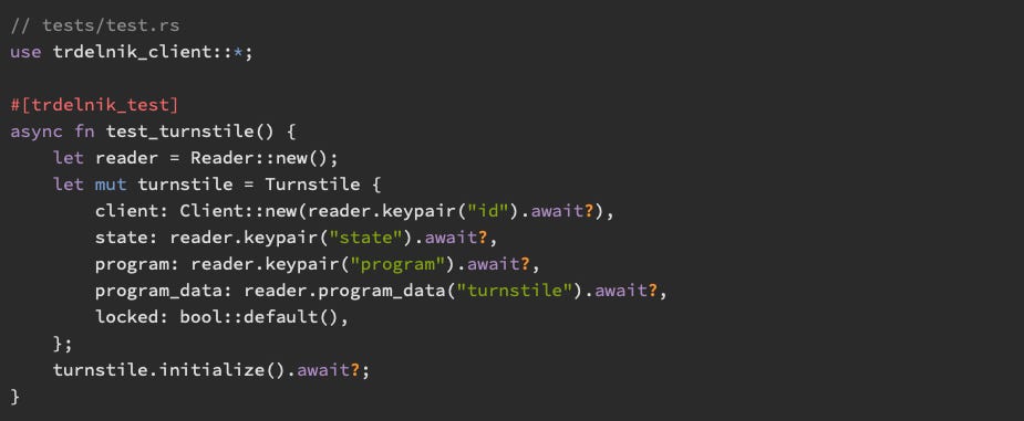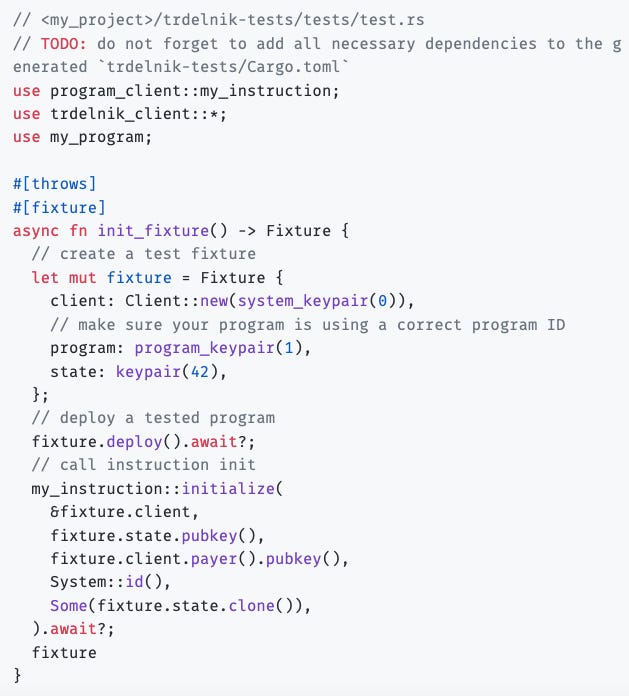 Trdelnik conveniently streamlines and manages the majority of the process, allowing developers to focus solely on their program and write tests in the same language as their programs, eliminating the necessity for JavaScript boilerplate as before.