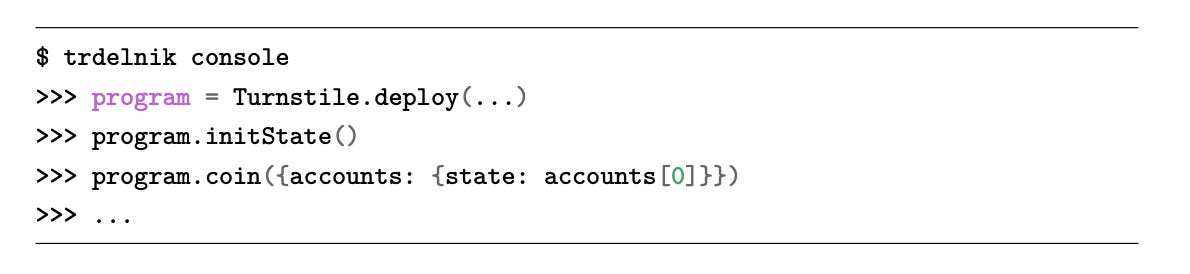 Incorporating a built-in console, Trdelnik provides developers with a command prompt interface for seamless program interaction. This feature allows developers to invoke individual transactions or perform interactive deployments conveniently. For an illustrative example, refer to the picture below: